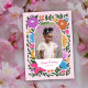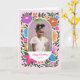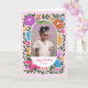 Denna vackra födelsedagsfoto välkomstkort har en handritad blomsterdesign i magenta / fuchsia rosa, orange, gyllene gul, lila, blå och grön på en anpassad färgbakgrund (visas i ljusrosa). Stilen på den blomsterdekorerade designen är nästan krita-liknande / pastellfärger. En oval / valvformad ram framhäver ett foto av den speciella lilla flickan i ditt liv!
