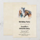 En födelsedagsinbjudan med en vacker akvarellteckning. Med en hästduo, brun och vit. Huvud och nacke synliga med droppande färg längs basen av deras nacke. Sydvästlig stil.