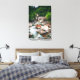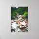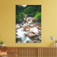 Fotografi av en vacker flod som kaskar genom en bergig flodbädd på en grumlig vår-dag med grönt träd runt.