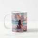 En vacker kvinna som bedrar sig på en strand med vit sand och glansigt glas. Rosa och blåfluffa moln och blek blå vatten. Namaste.