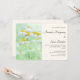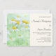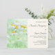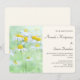 En bröllopsinbjudan med ett lugnt fotografi som visar en samling prästkragar med stora gula centra som växer i en grön äng.