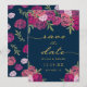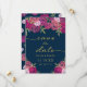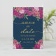 Berätta för dina nära och kära att de ska spara datumet för din bröllopsdag med detta eleganta blå kort med vackra rosa och lila nyanser blomsterbukett av akvarellrosor, gröna blad och guldfläckar.