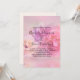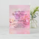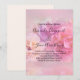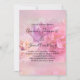 En bröllopsinbjudan med ett fotografi som visar en bukett rosa och vita nejlikor. Satt på en drömlik eterisk bakgrund.
