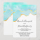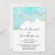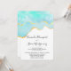 Bröllopsinbjudan med en sjudande sommardesign. Turkos/akvatisk grönt vattenfärgsbild med vågigt faux guld gräns. Elegant och underbar.