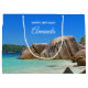 Grattis på födelsedagen-presentsäck med ett foto av en turkosblå havsstrand med stort sten som är spridd längs kusten. Ljus och soligt tropiskt språk.