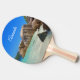 Pingpongpaddel med ett foto av en turkotisk blå havsstrand med stort sten utspridt längs kusten. Ljus och soligt tropiskt språk.