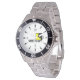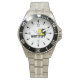 Text och en teckning i ett ljusbelyst gult och en halv ansikte silhouette-peekin bakom gardinen. Vit skuggig öga tittar på dig. Den roliga armklockan för roligt och bra stämning.