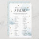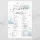 Den här söta "vad är i din handväska?"-babyduschkortet har en vit bakgrund med faux guld-stjärnor och blå fluffa moln. Baksidan har en baby blue bakgrund med faux guld star mönster. Du hittar matchande produkter i min butik.