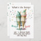 Söt och modern och trendig könsbestämning fest inbjudan kort med en akvarell illustration av glass i våffelkottar i rosa och blå med guld glass stänk. Texten säger "Vad är scoop? Pojke eller flicka?" Perfekt för en glass könsbestämning fest på sommaren.