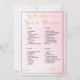 Gå in i en värld av fantasi och skratt med det fängslande spelet "What's in Your Purse" - ett perfekt som tillägg till din möhippa firande. Med en rosa ombre-bakgrund utlovar det här spelet en eftermiddag fylld med kamarader, överraskningar och glatta minnen. Det skuggande typsnittet i guld, "What's in Your Purse", inbjudan gäster som ska parkera i ett härligt äventyr genom sina handväskor. När de förstör de gömt skatterna visar varje post sitt eget poängvärde, från 5 till 20 poäng. Denna unika tvist på ett klassiskt spel ger en inslag av vänskaplig konkurrens och ett gemensamt intresse för er händelse. Med fokus på tydlighet och enkelhet presenteras spelobjekten i ett rent svart blockteckensnitt, så att alla enkelt kan delta. Etiketterna "namn" och "summa", tillsammans med deras medföljande linjer, läggs till i ett snyggt guld kursivt typsnitt, vilket ger en luft av sofistikering till den övergripande utformningen. Spelet "What's in Your Purse", som spelas in av en klassisk svart gräns, utstrålar en tidlös elegans som förstärker möhippans skönhet. Förutom själva spelet uppmuntrar denna erfarenhet till kontakter mellan gäster när de historier om sina unika upptäckter. Öka din möhippa med spelet "What's in Your Purse" (Vad är i ditt syfte), där äventyr anda möter vänskapens glädje. Det här spelet är mer än bara underhållning. Det är ett tillfälle att skapa omhuldade minnen, fira band och tillföra firande lite elegans. Hämta redot för en dusch fylld med skratt, anslutning och hjärtslitande överraskningar.