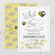 Vad ska det bli? " genderna visar inbjudningar till babydusch med bumble-/honungsbin och honungskammar på vit bakgrund. Baksidan har en ljussenapsbakgrund med gult mönster i humla och daisy. Anpassa efter dina behov. Du hittar fler matchande produkter i min butik.