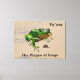 En något humoristisk illustration för Torah del Va'era, där de två första plagerna inträffar - Nile vatten vänder sig till vatten och sedan överfaller Egyptenen grodor. Bilden av en groda med mänskligt ben, Pharaoh's, som drar sig ur munnen och den strimlade blå och guld headdress som Paroh (Pharaoh) i allmänhet framställs som klädd, kasserad på marken. Bilden läggs ovanpå en bakgrund som påminner om ökenruinens vägg. Den egyptiska gudaten för fertilitet och förlossning Heket skildes som en groda eller kvinna med huvudet på en groda. På tempelväggar var hon i typfallet i antropomorfisk form, medan Heket i amulets vanligtvis var i djurform. Grodan var en lämplig symbol för fertilitet eftersom grodor och groddar var mycket vanliga i Nildeltat-regionen. Som en pestgroda kan man alltså se som en förevändning för den senare förstörelsen av egyptiska storstadsfåglar.