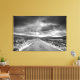 Det här fotot har en svart och vit bild av en väg som leder till en regnstorm.