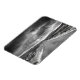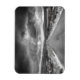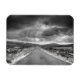 Det här fotot har en svart och vit bild av en väg som leder till en regnstorm.