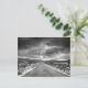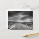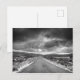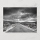 Det här fotot har en svart och vit bild av en väg som leder till en regnstorm.