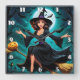 En glad häxa sprider sig på hennes broompinne, omgiven av fladdermus, med en glödande pumpa och gravestoner under fullt måne som ropar ljus.