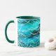 En bra kvalitets- vitmugg med en mörk - den gröna kanten och handtaget som dekoreras med ett vibrerande, handpainted, abstraktdesignen som föreslår, vinkar i blått, grönt, turkos och vit.