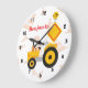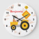 En kur för vägbyggen i Cute - perfekt för alla daghem eller barnsovrum. Med en verkstadsbyggnad i fordon och skyltar med trafikledningens bakgrund. Klockan kan vara personlig genom att byta namn. Underbar till ge som en gåva till en babydusch eller för att dekorera ett litet sovrum.