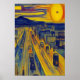Bilkörning på motorvägen i staden, färglöst himlar, gult sol och ett berg i bakgrunden i stil i Edvard Munch. Det här är en AI-skapad konst.