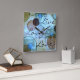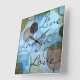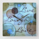 Tillverkad på en blå, brun och grå grönt bakgrund med cirkelformade och fyrkantiga former och inspirerad av "Live Laugh Kärlek".