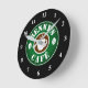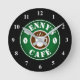 Småt kaféväggklocka med eget namn. Trendig för köksskåp, kaféer, kafeterior, restauranger, företag, kontor, pub eller affär. Vintage brun och grönt färg. Anpassa med ditt eget roliga citat, säg eller namn. Gör din egen dekormedbrottsling. dekorationer för trendig av älskare och koffeinmissbrukare. Kaffeböna och logotypen kopp.