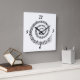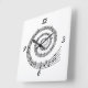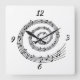 Svarta anteckningar i spiral på väggklockan ansikte.