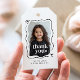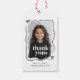 Tacka gästerna för att de kom till din lilla enes födelsedag med denna design, med eleganta svarta band, en lekfull vågig kant och utrymme för att lägga till ditt favoritfoto. Denna söta design toppas med ordet "tack" och ett litet hjärta bredvid.