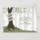 Ett vykort från bröllop spara datum med en illustration av träd i skogen. Träd har grönt löv, exponerade rötter och en trunk som är omsluten med banderoll som kan anpassas med brud & grooms namn.