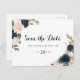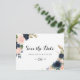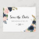 Det här blåa vågrät för vintertid är att spara det datum då vykortet är perfekt för guld bröllop. Utformningen har vackra, handmålade mörk blått, blå, marinerade, rosa, blommor, blommor från guld och blad av grönt, buntade i elegant bouquets.