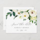 Det här vågrät för vit blommigt i eleganten sparar datuminbjudan vykort är perfekt för ett klassiskt bröllop. Den moderna vintagen har en vackert romantisk elfenben- och krämvattenfärg ro och blommor med mörk grönt löv, grönt och botaniskt material.