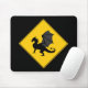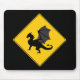 Var försiktig! Farligt villkor framför oss. Fantasy möter verkligheten. Dragon Crossing. Lustigt tecken som är gjort i stil på ett vägtecken.