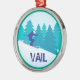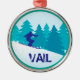 Vad är det bättre för ställe att tillbringa en jul-helgdag än på skidbackarna i Vail, Colorado? Även om du inte kan vara där personligen kan du ta dig dit i andan. Den har en cirkelbild i teal och blå av en silhuette snö skier framför gräs träd på ett snöberg. Grund har tryckt text i blått som säger VAIL. *Klippgrafik som används i denna design är upphovsrättsskyddad av Encore Software, Inc., som tillåter använda till licensgivarna. Alla rättigheter förbehållna.