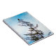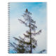 Ett fotografi av en amerikansk havsörn som sitter på toppen av ett högt tallträd. En blå himmel med dimmiga moln syns i bakgrunden. Spår av solljus och snö kan ses på trädet och dess grenar.