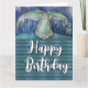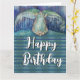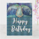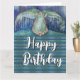 akvarellmålning i blått av svansen på en val med några svart-vita tatueringsmönster. Grattis på födelsedagen text