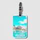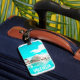Den snyggt vattenfärgen Valencia Spain Luggage Tag som visar den unika arkitekturen för byggnaden L’Hemisfèric. Produkten kan vara personlig. Underbar souvenir och presentidé.