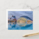 Vackert Valencia vykort med City of Arts and Sciences centrum. Centret designades av den berömda arkitekten Santiago Calatrava och representerar stolt den fantastiska skönheten i modern spansk arkitektur. Ett annat fängslande element i bilden är ljusen som kommer ut ur byggnaden och reflekteras i vattnet.