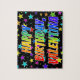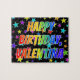 Den här livliga och livfulla pusselpusslet med födelsedagstext innehåller meddelandet"GRATTIS PÅ FÖDELSEDAGEN, VALENTINA" med tecknen som har en färgstark regnbågsspektruminspirerad gradient mönster, tillsammans med en roligt fält stjärnor, mönster. Ett färgstarkt pussel som det här kan vara ett roligt sätt att skicka ett födelsedagsmeddelande till hälsning till någon som heter Valentina. [~Z0000468]