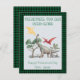 Roligt dinosaurie-kort för Alla Hjärtans dag i klassrummet! Framsidan har en scen med tre dinosaurier och det står "Valentine, du är DINO-mysig! Kanten är en grön och svart timmerhuggar-pläd. Längst ner står Glad Alla Hjärtans dag och sedan anpassar du det med ditt barns namn. Baksidan är helt grön och svart timmerhuggar-pläd.