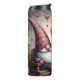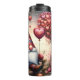 This enchanting digital illustration features a charming garden gnome resting on a rustic wooden bench next to a magical tree made of pink and red hearts. The gnome is dressed in intricate patterned attire with a tall, decorative hat and a long white beard, holding a single heart-shaped balloon. The scene is set against a soft wooden backdrop, framed by blooming spring flowers and delicate hanging heart ornaments. This seamless-style graphic is designed as a full-wrap for insulated tumblers, providing a high-impact, 360-degree visual experience. The warm, glowing light and whimsical romantic aesthetic make it an ideal gift for Valentine Day, anniversaries, or for anyone who loves fairytale-inspired garden decor.