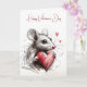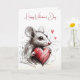 En vit mus klämmer ett stort rött hjärta omgivet av mindre hjärtan och sketchy linjer. Text kan ändras.