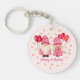 Den här söta Alla hjärtans dag-nyckelringen har två gnomer klädda i rosa med vita hjärtan och röda ballonger. Anpassa med din första namn. Designad av Susan Coffey.