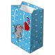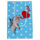 Valentine Shark Medium Gift Bag, med blå haj som följer ett rött hjärta krok, blå bakgrund med små vita hjärtan.