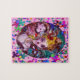 Viktiga och konstnärliga målningar med färgstark konfetti..Mythical kärlek mellan Harlequin och Columbine,Akrylmålning inspirerad av venetianska luddermasker och Commedia dell'arte - Venedig. Bright lila rosa gult grönt färg