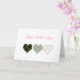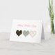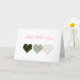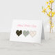 Min digitala design har tre hjärtan i nyanser av rosa, grått, grönt och svart på en krispig vit bakgrund. Varje hjärta har en spaljé av murgröna och rosenknoppar. Ditt meddelande i det vackra rosa teckensnittet kan anpassas på framsidan och insidan av kortet.
