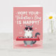 This Valentine's Day card features a gray tabby cat with darker stripes and white fur, facing forward with a big, happy smile. The cat wears oversized heart-shaped sunglasses with dark lenses, giving it a fun, romantic look ❤️. Its paws rest on a bright red, compact electronic keyboard, like it’s about to play a sweet little tune. The background is a soft, muted rosy pink that keeps the focus on the cat and the message. Across the top, the card reads “HOPE YOUR Valentine’s Day IS HAPPY!” in white block-style letters that stand out clearly. Small heart doodles and a little “xo” sit near the wording, adding an extra note of affection 💌🍫. Share some love with this card today.