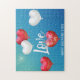 Glad Alla hjärtans dag: "Kärlek är i luft", röda och vita ballonger, vacker och modern illustration. Text skriven i det moderna typografiskriptet brev med realistiska 3D-ballonger i hjärtformer på blå himmel-bakgrund.
