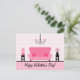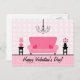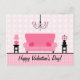Ett vykort från Alla hjärtans med en illustration av ett rosa vardagsrum som är komplett med en rosa soffa med hjärtformade dekorativ kudde, en hjärthandlare och sluter bord med en vas av rosa blommor och en hjärtformade lampa. Polka punktbakgrund. Texten i grund lyder: "Grattis på Alla hjärtans dag!"