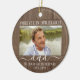 Hedra en avlidne anhörig under högtiden med en anpassad foto rund keramisk julgransprydnad i falskt trä. All text och alla bilder på denna mall är enkla att anpassa. "För alltid i våra hjärtan" kan ändras till "till minne av", "en ängel i himlen" eller annan text. (TIP: Ett enkelt sätt att centrera ett foto exakt som du vill är att beskära det innan du laddar upp det till Zazzle-webbplatsen.) Den moderna lantliga designen har en rustik brun falsk trägräns, elegant handskriven stilspråkskalligrafi, skrivmaskinstypografi namn och år och två bilder som du väljer. Denna unika och moderna minnesgåva är en genomtänkt begravningsidé och lägger till en stilren touch till juldekorationer i hemmet. Det är ett