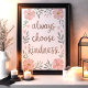 Sprid positivitet med denna vackra "Välj Alltid Vänlighet" väggkonst. Med ömtåliga rosa blommor och grön lövverk runt den handskrivna texten, tillför detta konstverk en mild påminnelse om vänlighet till alla utrymmen. Perfekt för att skapa en fridfull atmosfär i ditt hem, kontor eller som en genomtänkt present till någon speciell, denna konst uppmuntrar till ett liv fyllt av medkänsla och positivitet.