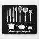 Välj ditt vapen! Roliga och uppsluppna matlagningförkläden, skjortor, utslagsplatsskjortor och gåvor för den sakkunniga kocken, kocken och grillfesten. Humoristiska matlagningutensils med krukar, knivar, spateln och mer. Gullig och kall kock förkläden och gåvor för jul, födelsedagar eller några orsakar.